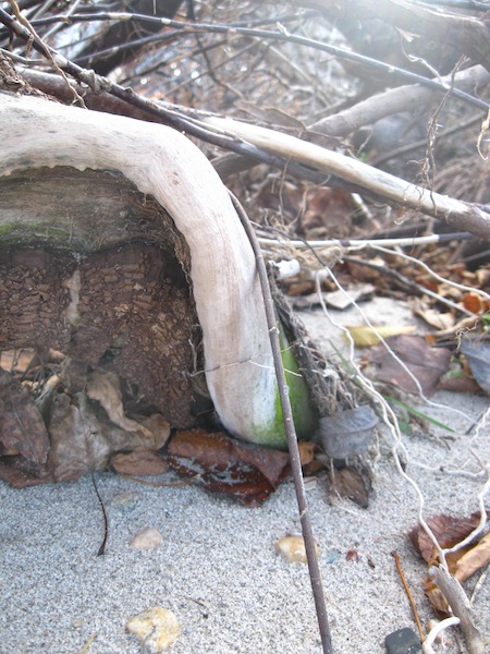 After we left the washed up dock/sitting area, we walked along what used to be a path through woods near the water. Now it is right on the water with some very interesting decor. Like this mock volcano all covered in green residue. I'm guessing it's a former tree's roots. The tree is long gone, and these are it's remains- I suppose.